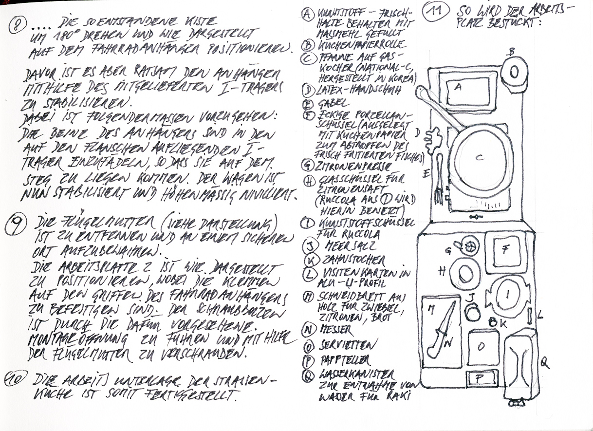 Die Standorte sind über die gesamte Stadt Wien verteilt und folgen einem imaginären Pfad, der im Laufe der 2 Wochen immer erkennbarer werden wird. Die Auswahl der Punkte orientiert sich an der Qualität der Plätze aufgrund ihrer Besucherfrequenz zu bestimmten Zeiten, ihrem Konsumpotentials in der näheren Umgebung, ihrer exklusiven Isoliertheit. Großartige Fallbeispiele dafür sind der Florida-Tower zur Rushhour, die Twin-Towers zum Lunch, das Burgtheater nach einer Vorstellung. Der gesamte Abfolgeplan wird im Vorfeld bei der Behörde angemeldet und um Genehmigung der Kunstaktion im Rahmen von Soho in Ottakring angesucht. An den Plätzen wird für den Zeitraum von maximal 1,5 Stunden eine mobile Straßenküche aufgebaut und aus einem begrenztem Vorrat aus frischem Gemüse, Brot und Fisch eine warme Spezialität auf einer Garplatte zubereitet und verkauft.